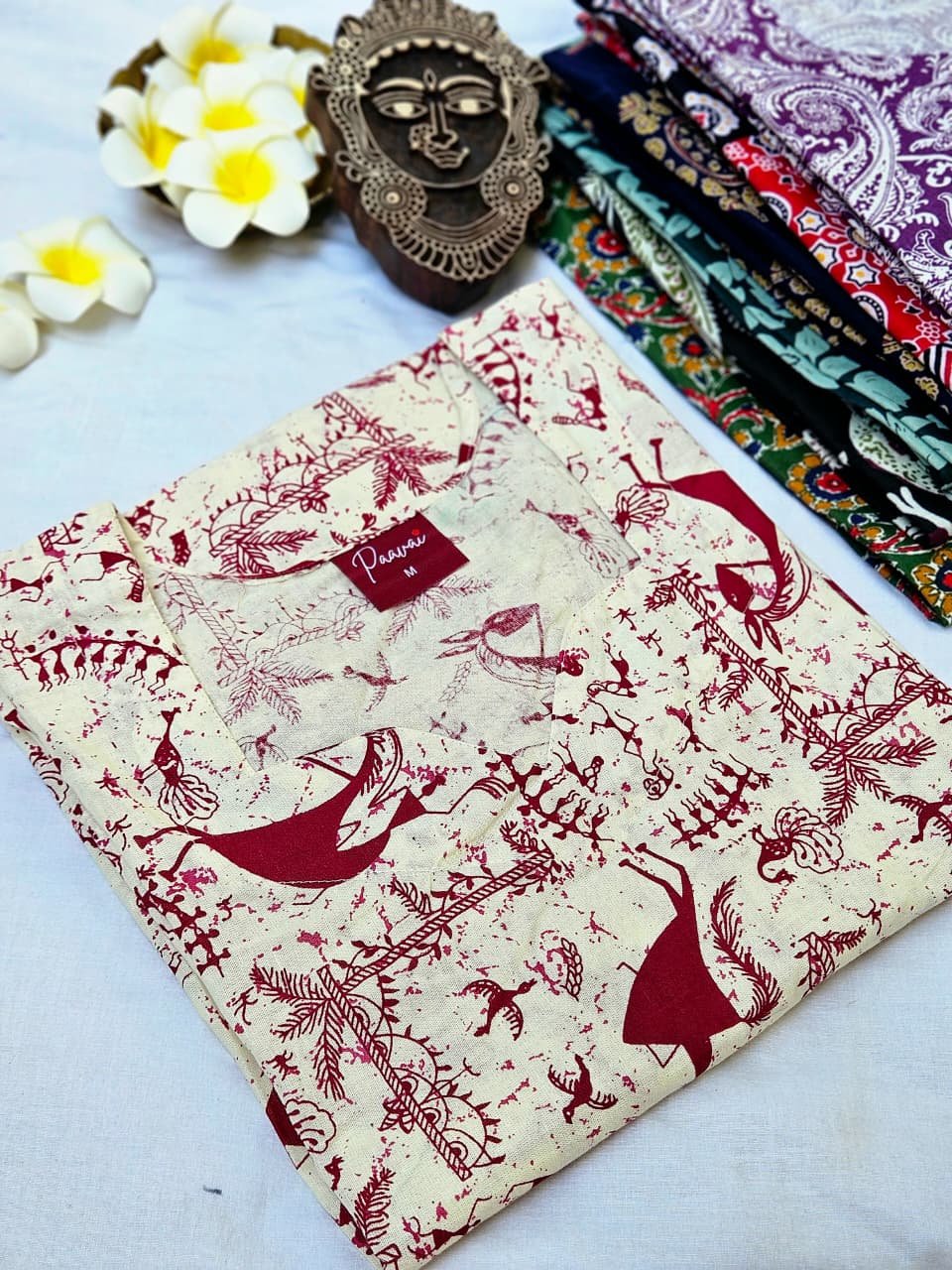 Elegant cream cotton kurti with maroon Warli tribal prints—perfect for casual or festive occasions.