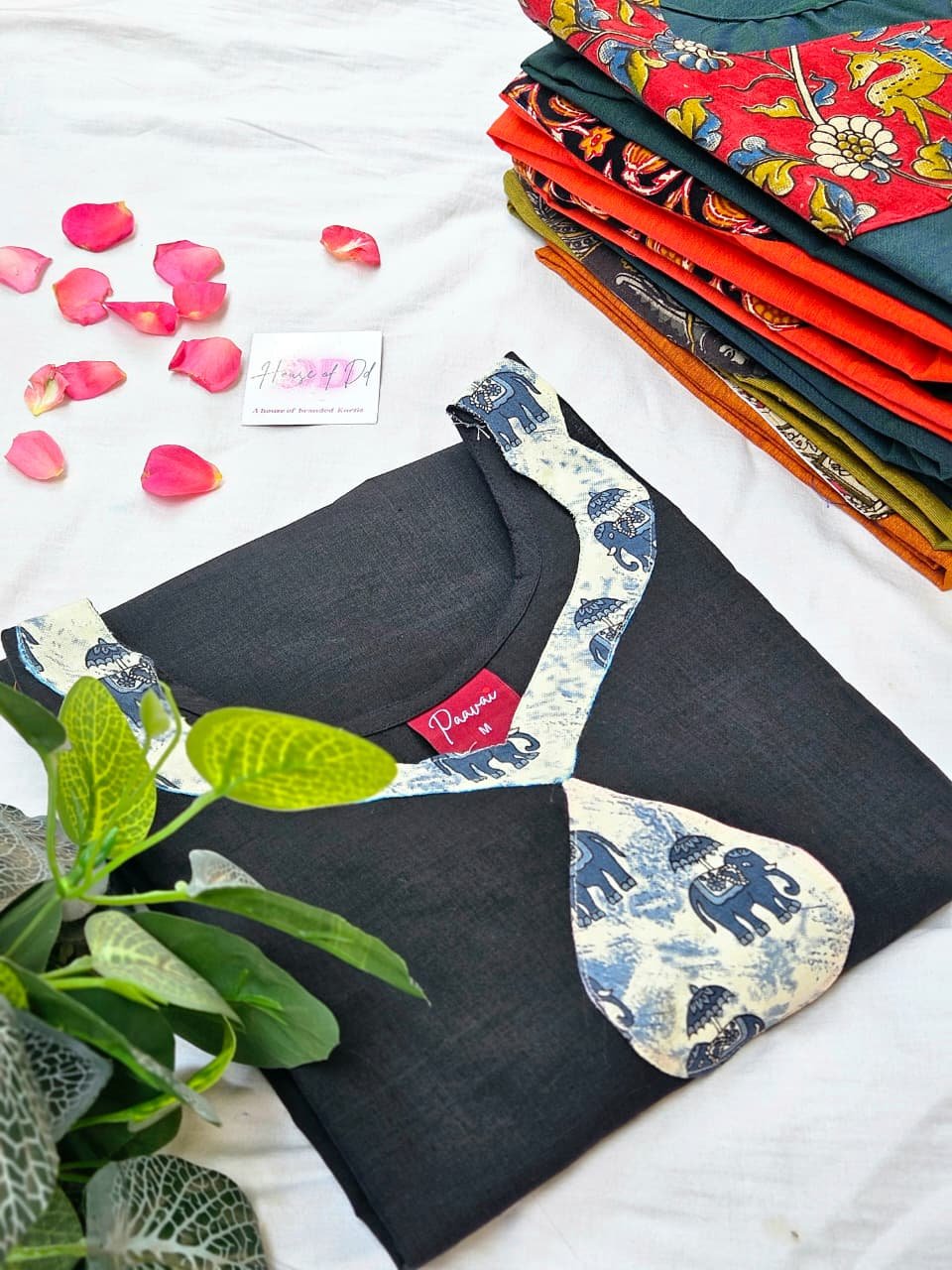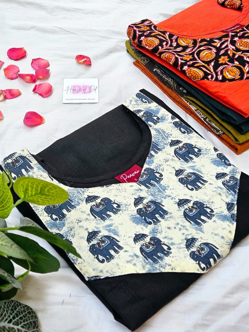 “Experience the timeless charm of traditional Indian craftsmanship with this exquisite kurti. Made from premium Mangalagiri cotton, it offers a comfortable, breathable fit, perfect for all-day wear. The kurti features a captivating Kalamkari print, showcasing intricate elephant motifs that bring a touch of tradition and artistry to the design. The contrasting neckline and detailing add a modern flair, making it ideal for both casual and festive occasions. Whether you’re attending a cultural event or simply looking to elevate your everyday style, this kurti seamlessly blends heritage with contemporary elegance.”