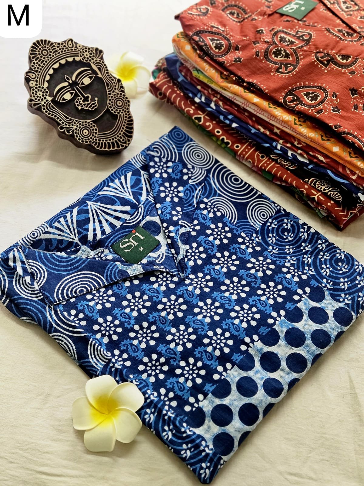 Soft and breathable women’s cotton kurti featuring a rich indigo base with spiral and floral-inspired block prints. Lightweight, comfortable, and perfect for daily wear and casual use.
