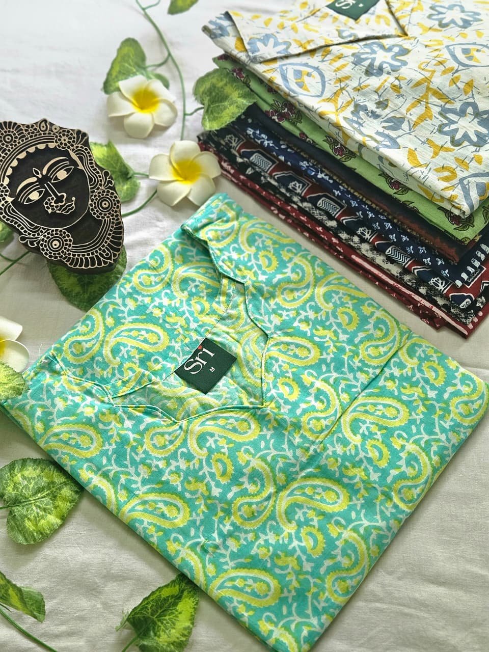 Soft and breathable women’s cotton kurti top featuring an elegant ethnic paisley floral print. Lightweight, comfortable, and perfect for daily wear, office use, and casual outings.