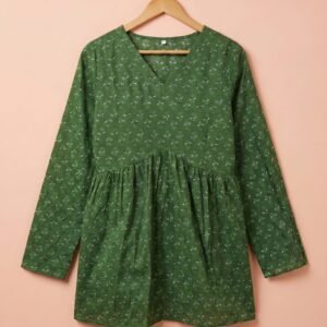 “Brighten your day with the Emerald Bloom Floral Kurti. This vibrant green kurti features delicate floral patterns and a classic round neckline. Made from soft, breathable fabric, it’s perfect for casual or festive occasions, bringing elegance and comfort together.